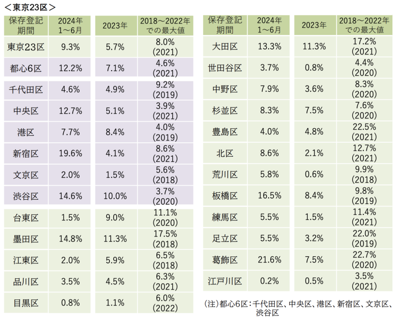 国土交通省は11月25日、登記情報を活用した新築マンション取引の調査結果を公表しました。短期転売は総じて都心部が多い傾向にありますが、大田区や板橋区、葛飾区など10〜20%を超えている区も見られます。